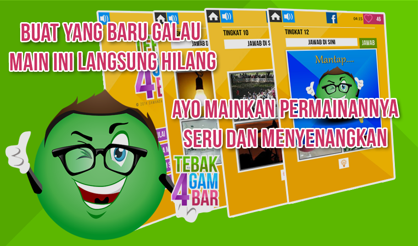 Tebak 4 gambar adalah permainan yang mirip dengan tebak gambar, mungkin teman-teman yang sudah memainkan game tebak gambar pastinya sudah tidak asing kan, nah buat kamu yang merasa sudah selsai memainkan game tebak gambar dan merasa lebih tertantang lagi dengan soal soal yang sedikit lebih sulit coba saja game Tebak 4 Gambar ini.